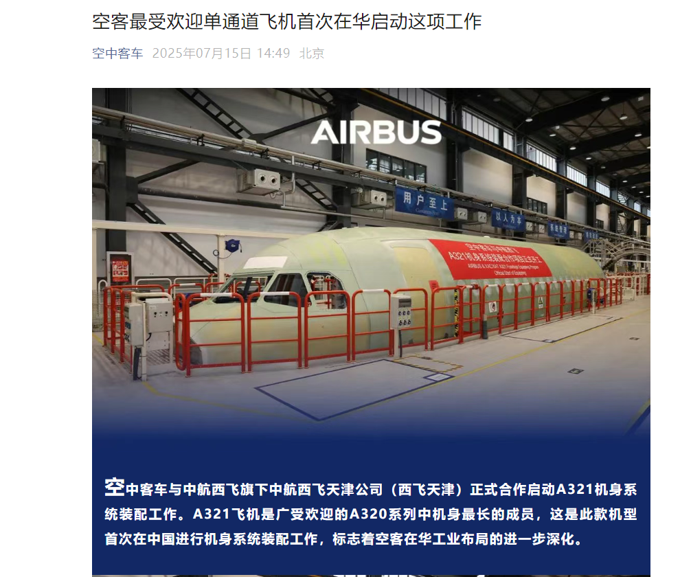 每经AI快讯,据空中客车微信公众号7月15日消息,空中客车与中航西飞(000768)旗下中航西飞天津公司(西飞天津)正式合作启动A321机身系统装配工作。A321飞机是广受欢迎的A320系列中机身最长的成员,这是此款机型首次在中国进行机身系统装配工作,标志着空客在华工业布局的进一步深化。